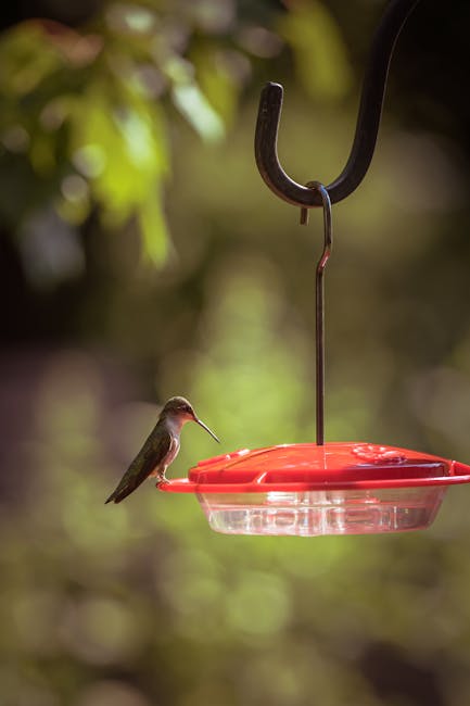 Choose a feeder that is easy to cleanand refill. A feeder with bright red partsattracts hummingbirds well. Select one with multiple feeding ports so more birds can feed at once. Avoid feeders with yellow partsas they do not attract hummingbirds. Glass feeders are durable and easy to clean, but plastic ones are lighter and less breakable. Make sure the feeder has a built-in ant moator add one to keep ants away. Choose a size that fits your space and how often you want to refill it. A feeder that hangs easily from eaves will make your job simpler. Look for one with a hook or loop that fits your hanging hardware.