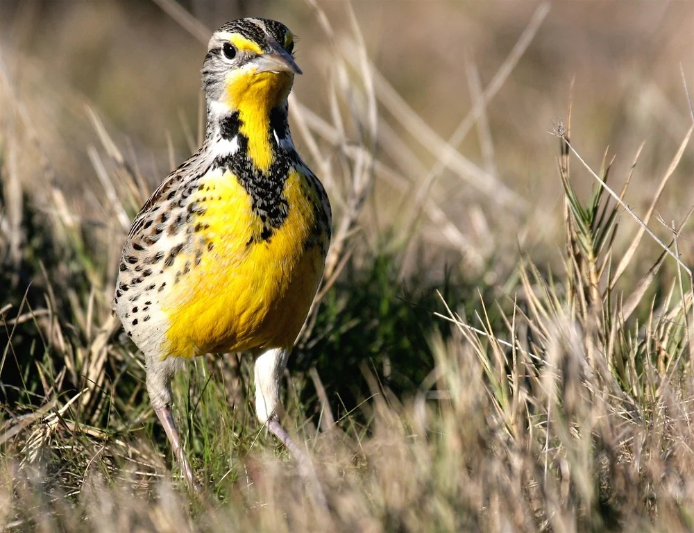 The Western Meadowlarkis a medium-sized bird with bright yellow underparts. Its distinctive black “V”on the chest makes it easy to recognize. The bird has a long, pointed billand brown back with streaks for camouflage.